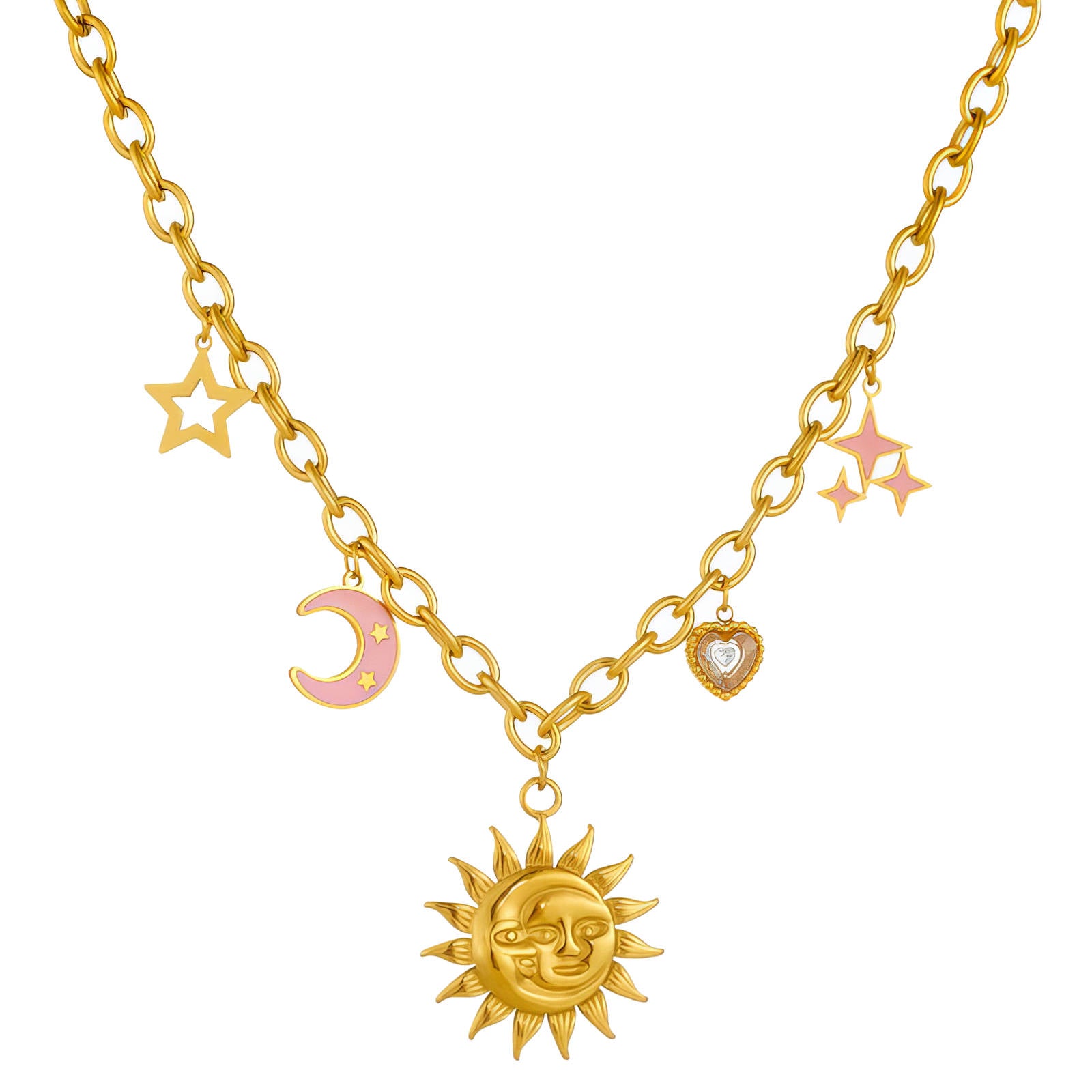 Crescent And Sun Necklace, 18K Gold Plated Steel